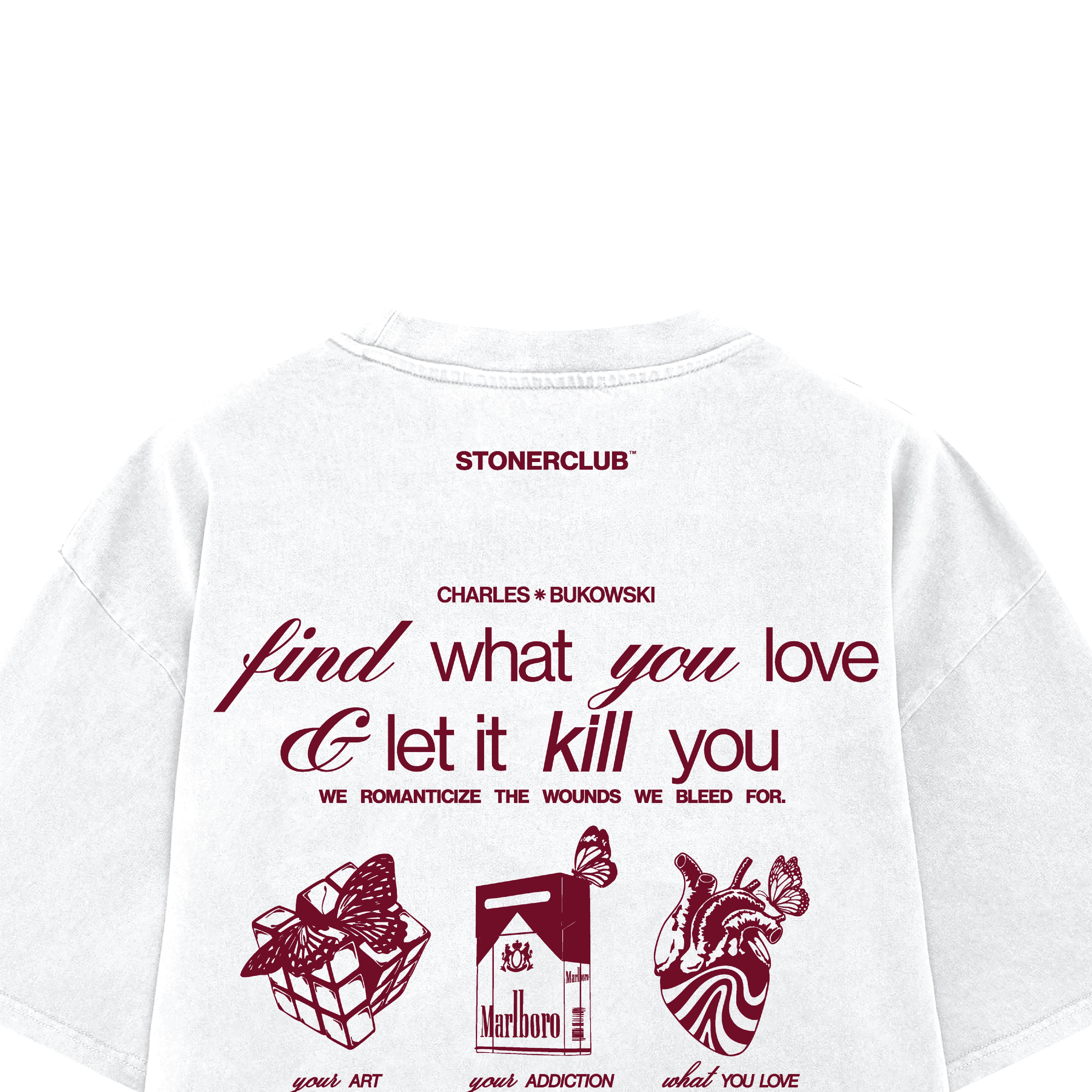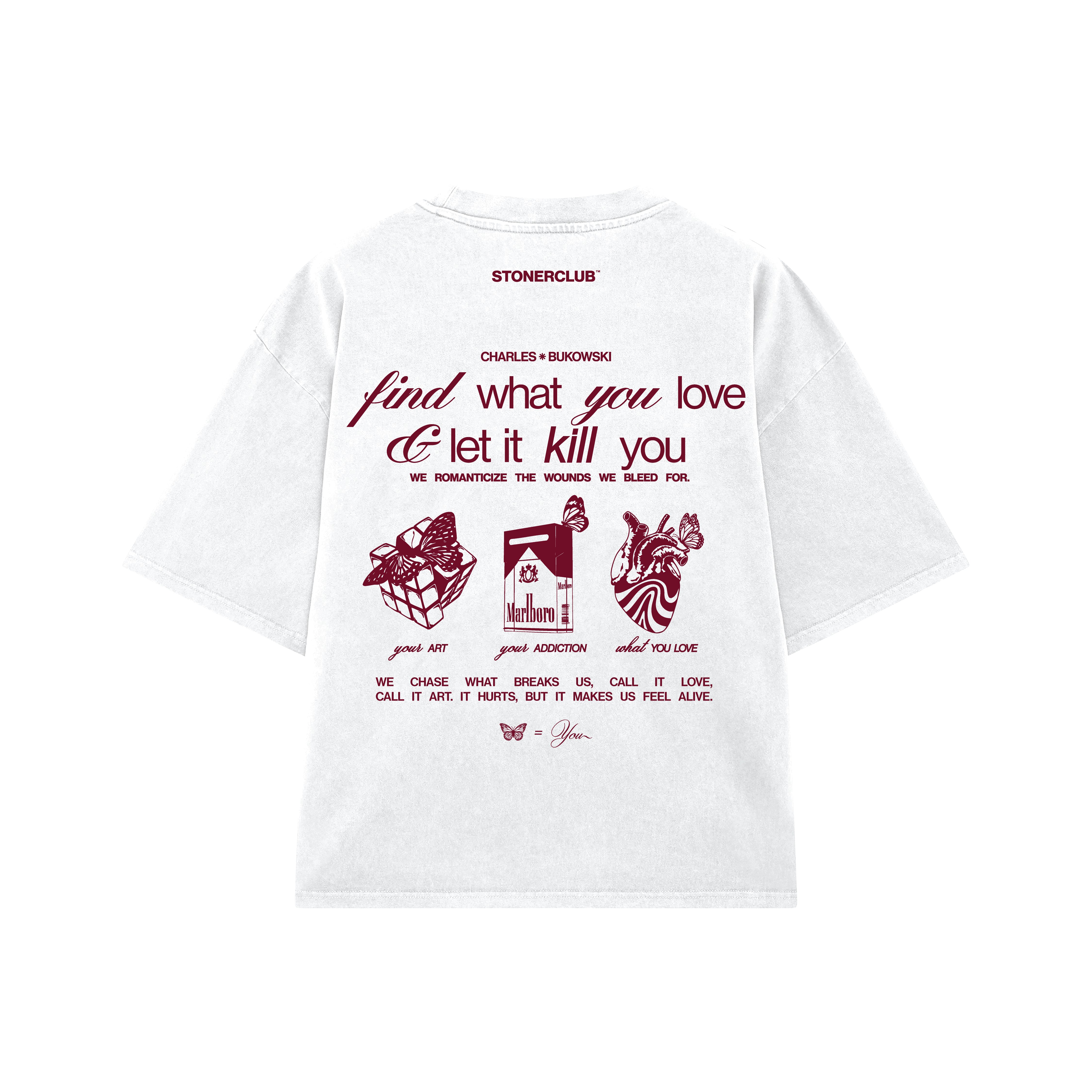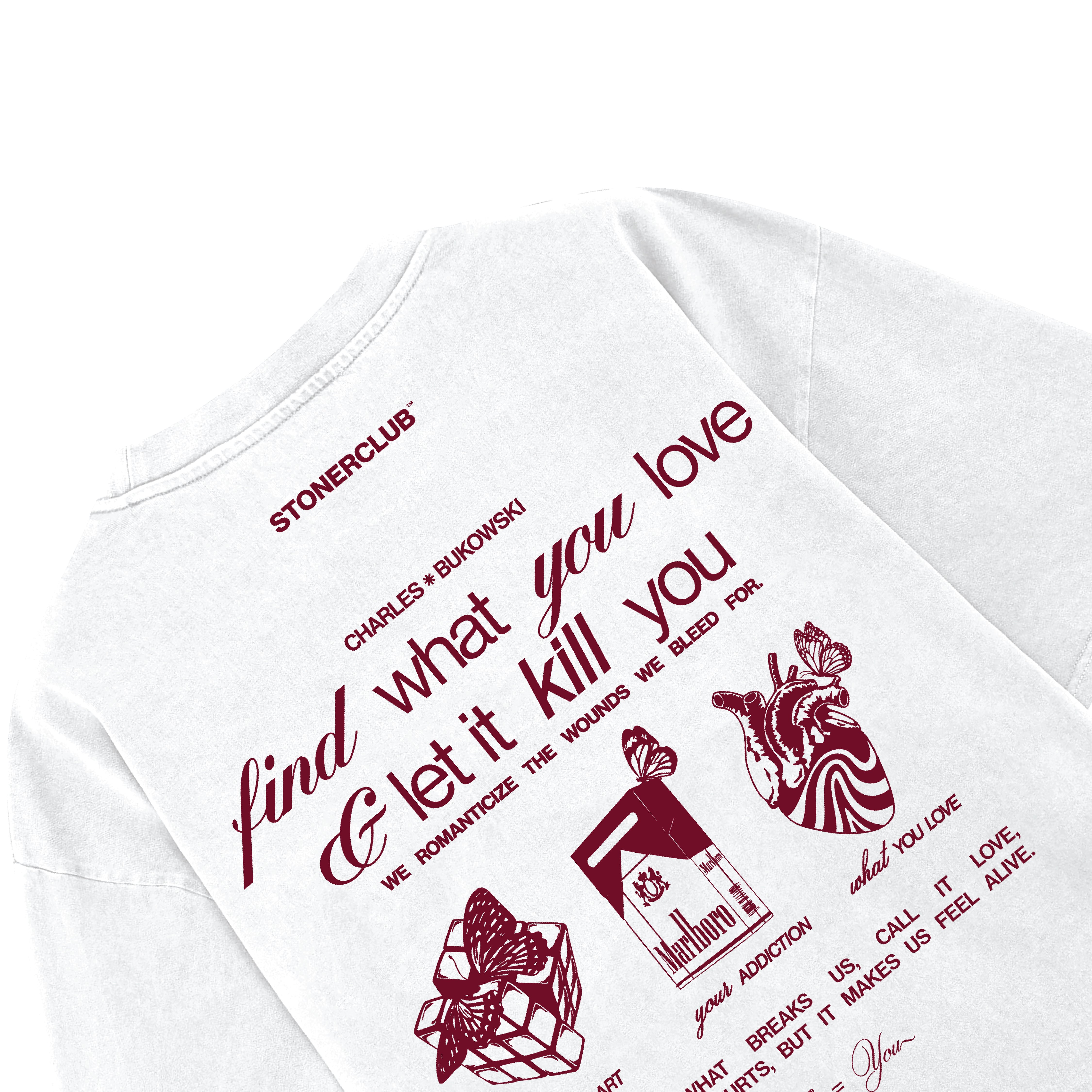 Embrace the raw intensity of Charles Bukowski’s words with this striking design, featuring his powerful phrase "Let It Kill You" emblazoned on your back. This statement piece captures Bukowski’s fearless approach to life’s struggles, inspiring resilience and authenticity. Perfect for those who appreciate bold literary expression and want to carry a reminder of embracing life’s challenges fully.